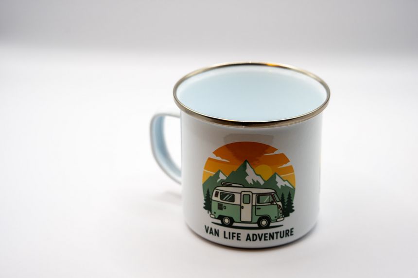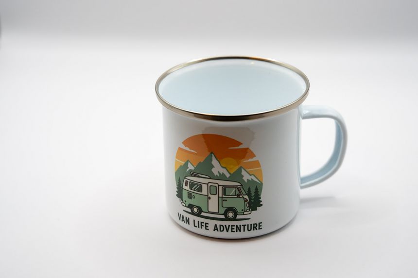 Stylový smaltovaný plecháček s motivem dodávky, hor a zapadajícího slunce. Ideální společník na cesty do přírody, pod stan, k ohni nebo jen na ranní kávu na terase. Vychutnejte si svůj oblíbený nápoj stylově – ať už je to čaj, káva nebo grog – v outdoor plecháčku, který vás naladí na další dobrodružství.